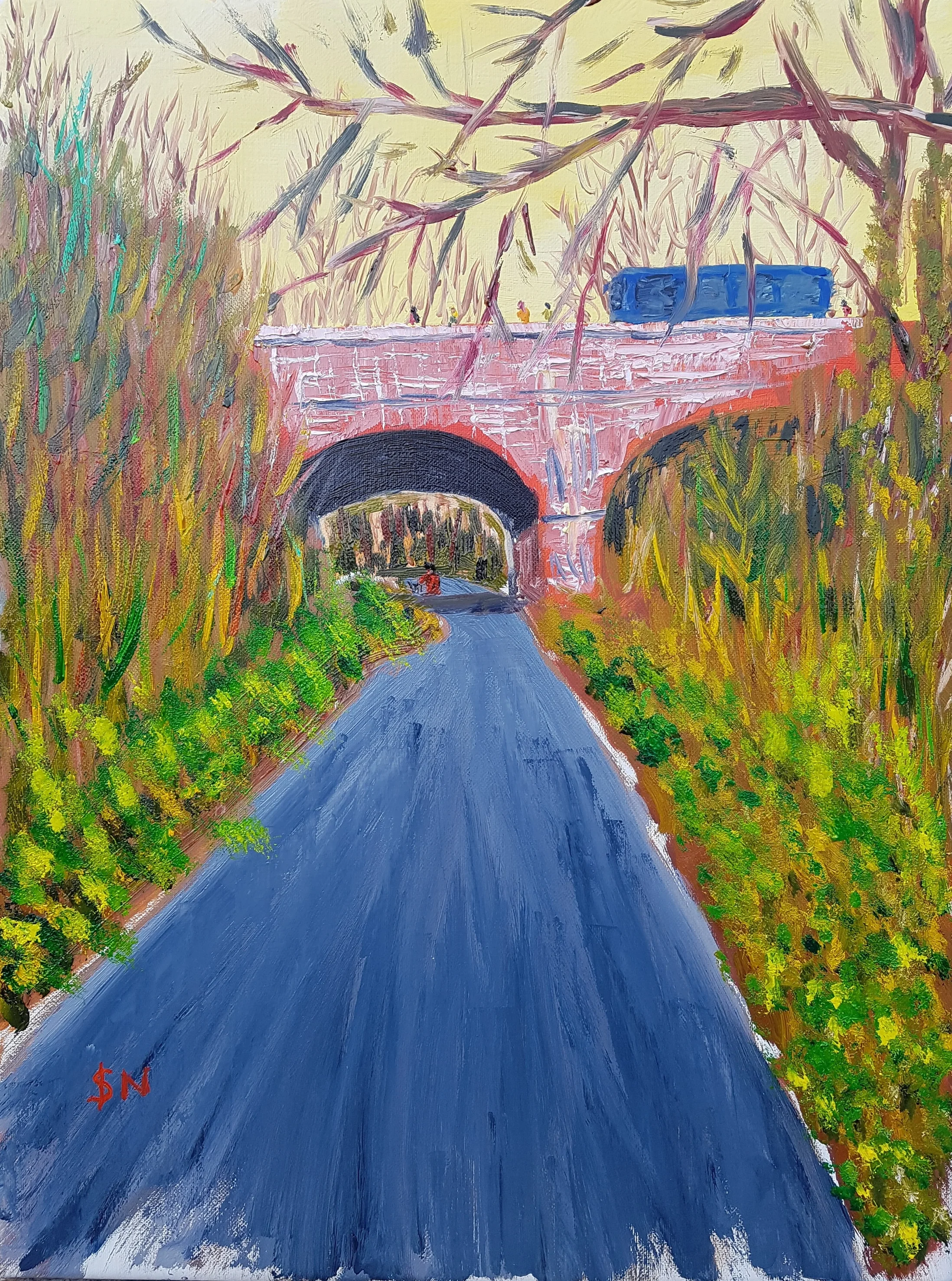 Although it is used by many people to avoid traffic and by dog walkers, I have only discovered it by accident. One day, arriving very early to work I decided to have a little walk around Buxton area, where I was. So, walking down the road I crossed the bridge and seen the foot path. I took few pictures and decided that they would make a nice little painting.