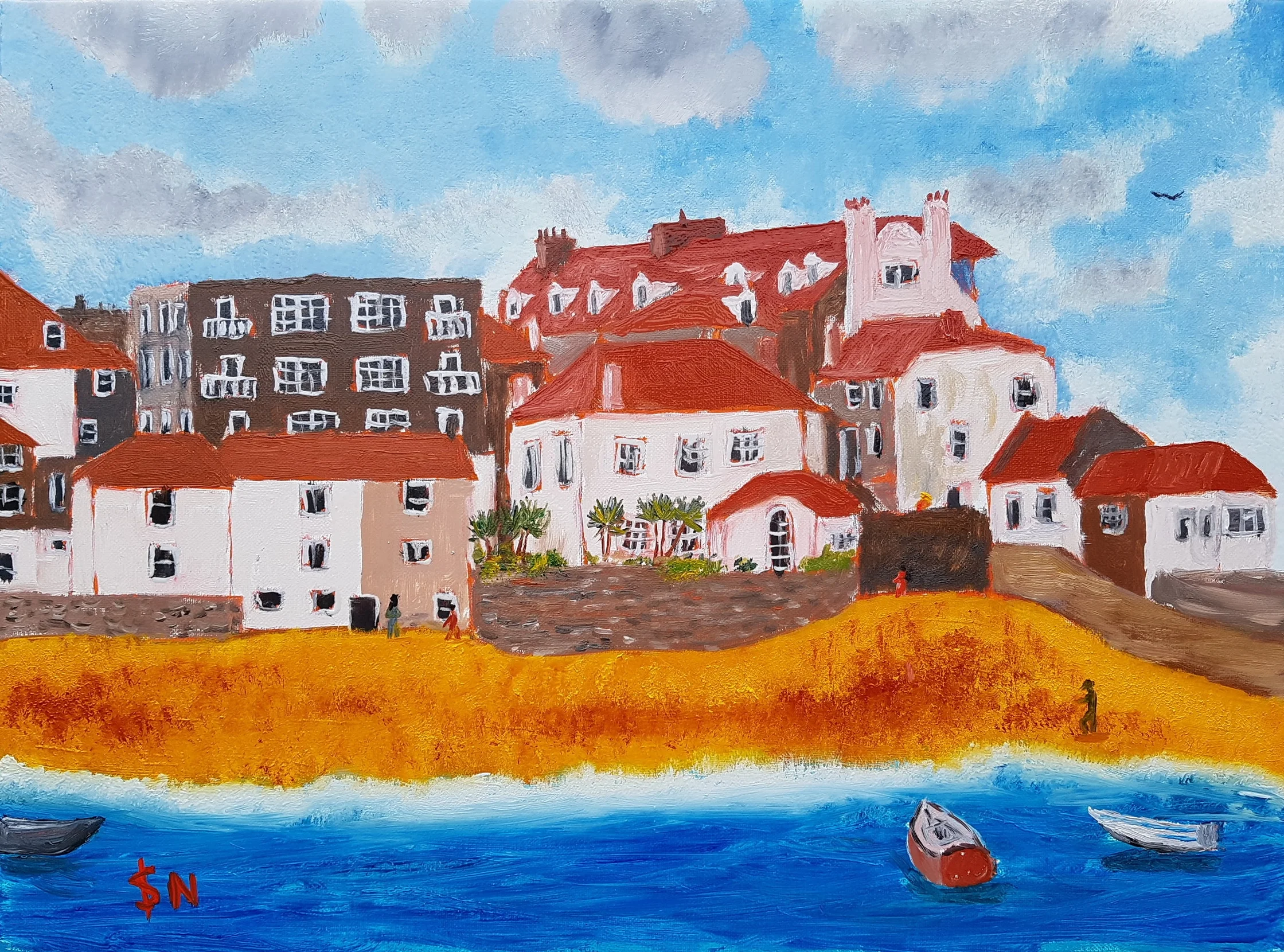 For the sky I used cobalt blue, with a touch of cerulean, for houses I used a mixture of cobalt blue and neutral grey, street lights warm white with cadmium yellow and for stars cerulean blue with warm white, and cadmium red, with a touch of cadmium yellow for Aldebaran.